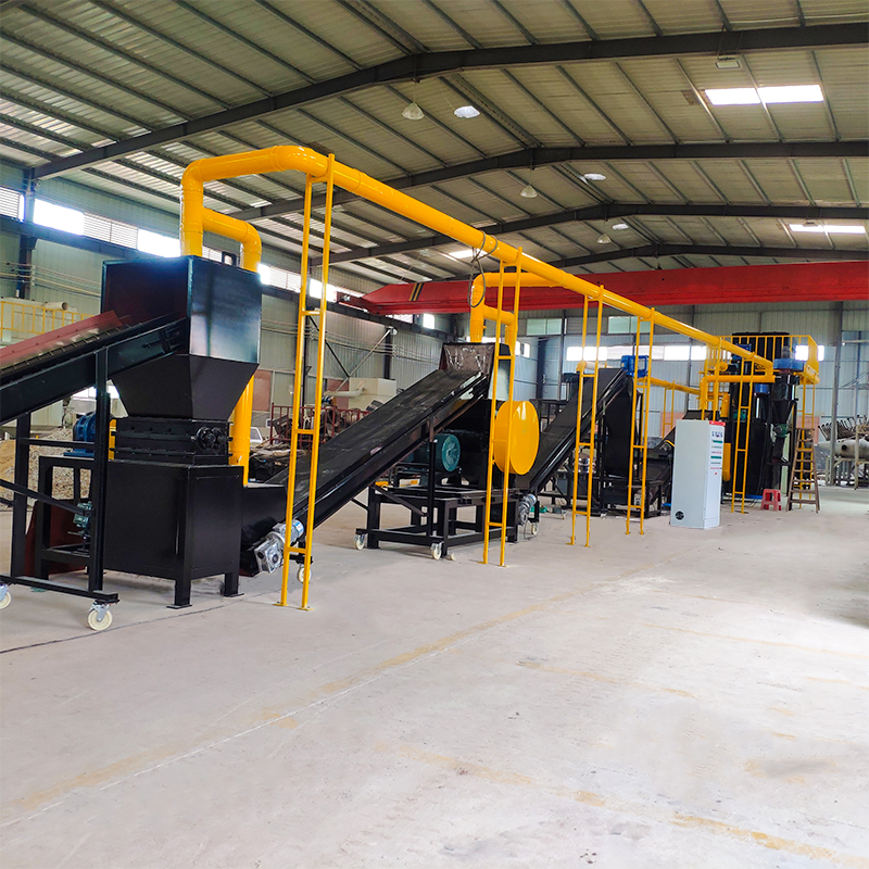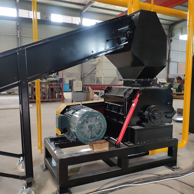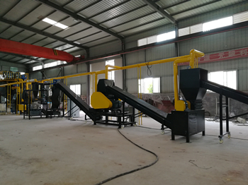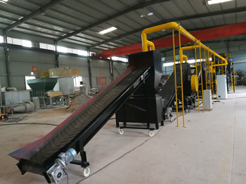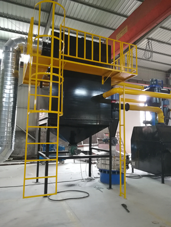 由輸送機將物料送入一級破碎機中進行粗破碎,粗破碎后的物料再通過輸送機送入二級破碎機中進行第二次破碎,二級破碎機破碎后的物料進入到輸送機中同時設(shè)置磁選設(shè)備,可以將物料中的鐵分選出來。物料輸送機和磁選器去除鐵后,進入到三級破碎機中進行細破碎,將物料破碎至粉末。粉末狀態(tài)的物料由負壓系統(tǒng)進入到旋風分離器中進行空氣過濾,并通過風機落至氣流分選機上,由氣流分選機分選,使不同密度的物質(zhì)進行分層,最后得到金屬分選出來,而所有的非金屬由負壓系統(tǒng)帶入脈沖除塵器進行集中。而過濾得到的尾氣將繼續(xù)由負壓系統(tǒng)送入到尾氣處理設(shè)備中進行空氣凈化,使之達到國家排放標準后再進行高空排放。